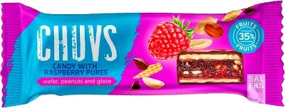 A Saleks Chuvs Nápolyi szelet Málnával és Földimogyoróval (30 g) több vékony ostyalap közé rétegzett malnaízű krém és ropogós földimogyoró-darabok harmonikus kombinációja – tökéletes gyümölcsös-földimogyorós nassolnivaló gyors energiáért.
