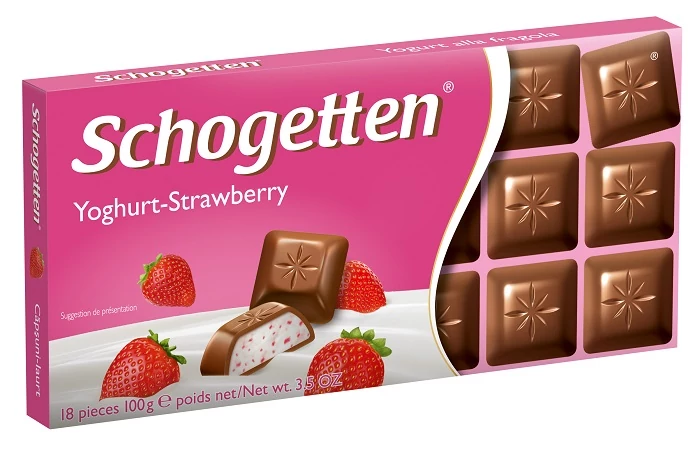 Fölözött tejből készült joghurt és eper ízesítésű krémmel (46%) töltött tejcsokoládé.