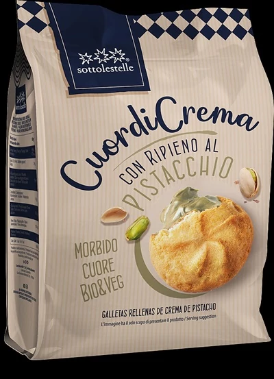 A Sottolestelle Bio Pisztáciakrémmel Töltött Keksz egy különleges, prémium minőségű, organikus alapanyagokból készült édesség. A ropogós, aranybarna keksz szívében lágy, krémes bio pisztáciatöltelék található, amely gazdag, természetes pisztáciaízt biztosít. Kiváló választás teához, kávéhoz vagy finom nassolnivalóként a nap bármely szakában.