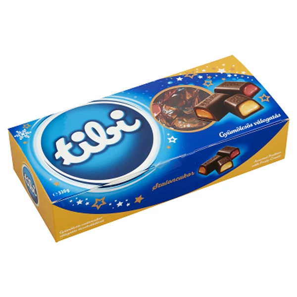Tartalmaz: kakaóvajat, tej, emulgeálószert (lecitin - szójából származhat). Nyomokban tartalmazhat: diófélék, glutént.Szaloncukor 330G Tibi Gyümölcsös Válogatás