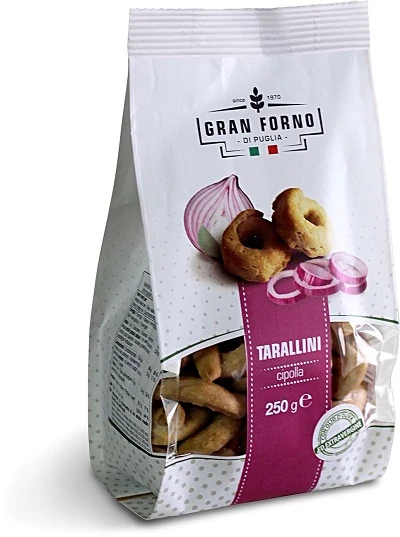 A Tarallini hagymás snack ropogós, ízletes olasz aprósütemény, melyet finom pirított hagyma aromája tesz különlegessé. Tökéletes választás aperitifként, borvacsorákhoz, vendégvárónak vagy könnyed nassolnivalónak.
