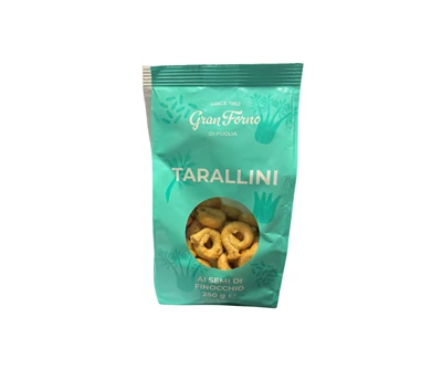 A Tarallini köményes snack hagyományos olasz recept alapján készült ropogós, ízletes aprósütemény, melyet finom köménymaggal lehetől. Édes vagy sós kiegészítőként, aperitif falatokként vagy borvacsorák kísérőjeként egyaránt kiváló.