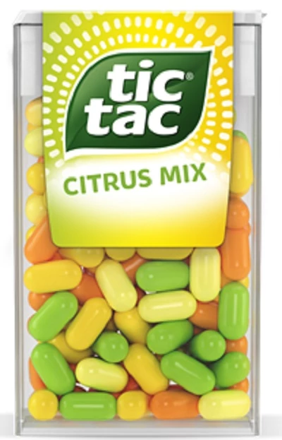A Tic-Tac Citrus Mix frissítő mentolos cukorkák keveréke, amely a citrusok élénk ízét kínálja. Kiváló választás a friss leheletért és a gyors felfrissülésért bármikor.