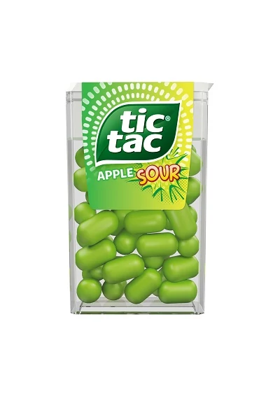 A Tic-Tac Apple Sour egy frissítő mentolos cukorka, amely élénk alma-savanykás ízzel rendelkezik. Kiváló választás a gyors felfrissüléshez és a friss leheletért bármikor.