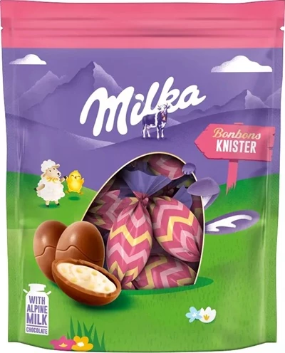 A Milka Knister tojás 86 g egy különleges tejcsokoládé, amely pattogó cukorkadarabokat tartalmaz. A krémes alpesi tejcsokoládé és a szájban pattogó élmény egyedi kombinációt nyújt.