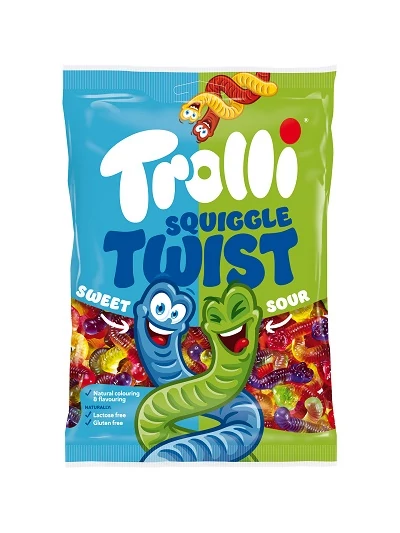 Allergének: Nyomokban tejterméket, mogyorót és glutént tartalmazhat. Száraz, hűvös helyen, légmentesen zárva, közvetlen napfénytől védve tárolandó.Trolli 100G Squiggle Twist