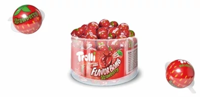 A Trolli Töltött Golyó Eper ízű gumicukorka savanykás eperaromával és folyékony, gyümölcsös töltelékkel.