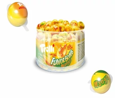 A Trolli Töltött Golyó Mangó egy egzotikus ízvilágú gumicukorka, savanykás-mangós ízesítéssel és folyékony töltelékkel. Rágós állaga és édes-savanyú belseje.