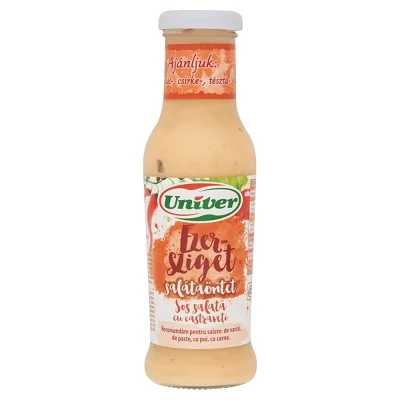 Az Univer Ezersziget salátaöntet egy klasszikus, krémes dresszing, mely zöldségeknek, tésztasalátáknak és hidegtálaknak ad üde, enyhén édeskés-savanykás ízt. Majonéz, ketchup és fűszerek harmonikus egyvelege, amely minden salátát különlegessé varázsol.