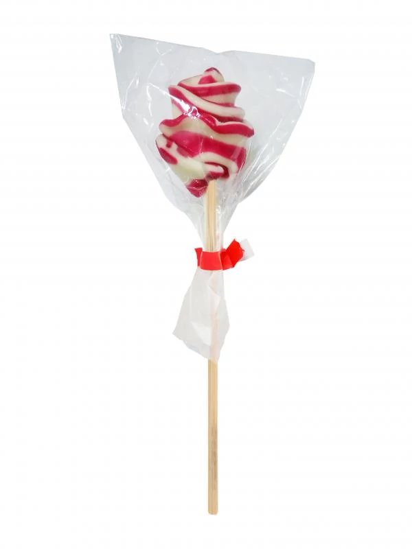 Színes csíkokkal díszített keménycukorka fapálcával |