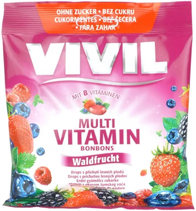 Erdei gyümölcs ízű, cukormentes, töltetlen keménycukorka, édesítőszerekkel és hozzáadott vitaminokkal