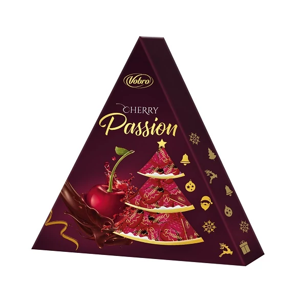 A Vobro Cherry Passion 126 g Karácsonyfa ünnepi formájú, puha cseresznyés gumicukor – élénk színek, intenzív cseresznyearoma és lágy textúra minden falatban.