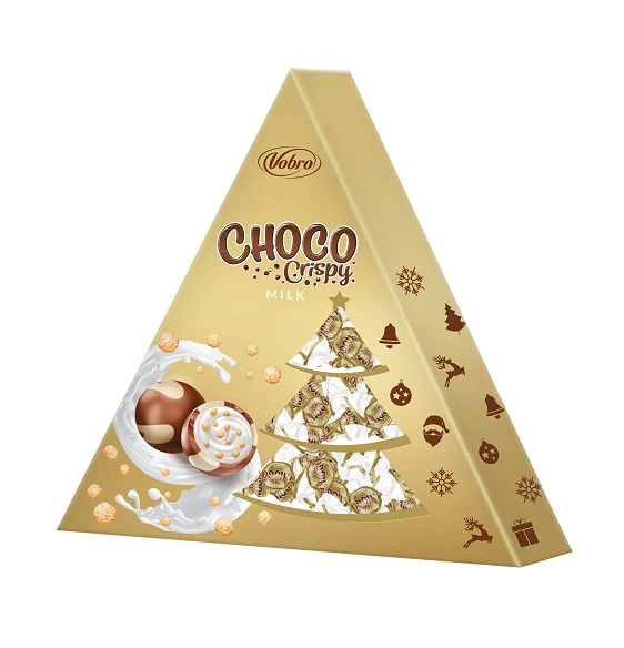 A Vobro Choco Crispy Karácsonyfa Arany (112 g) ünnepi formájú, ropogós gabonapelyhes magvakkal dúsított tejcsokoládé bevonatú édesség – aranyfényű fénylő csomagolásban, tökéletes karácsonyi ajándék vagy nassolnivaló.