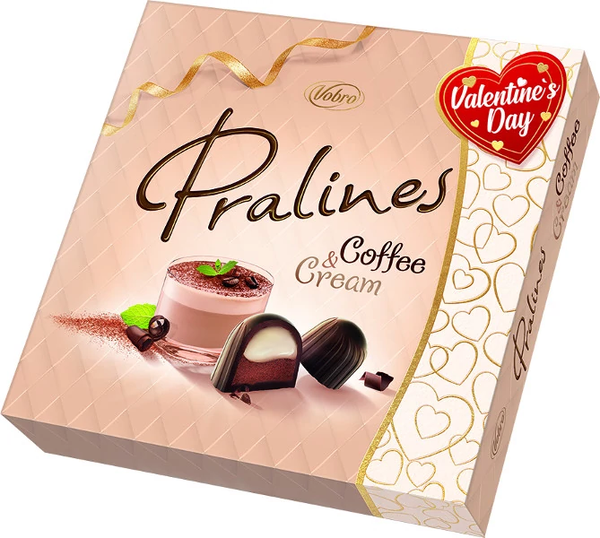 A Vobro Praliné Coffee 127 g finom tejcsokoládé praliné erőteljes kávékrémes középponttal – gazdag íz, lágy textúra és elegáns élmény minden falatban.