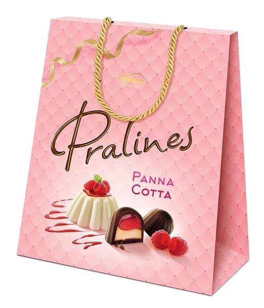Málna és panna cotta ízű töltelékkel (50%) töltött étcsokoládé praliné