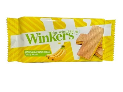 Kellemesen édes, ropogós ostyalapok között finom banán ízű krémmel töltve.